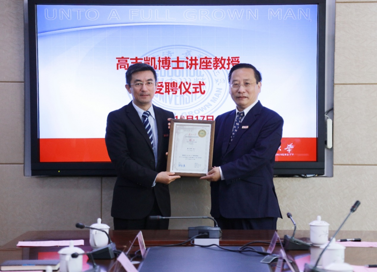 张晓宏副校长首先向与会领导嘉宾介绍高志凯教授的简要经历与学术成就。随后他宣读了学校聘任文件。熊思东校长向高志凯教授颁发聘书并为其佩戴校徽。